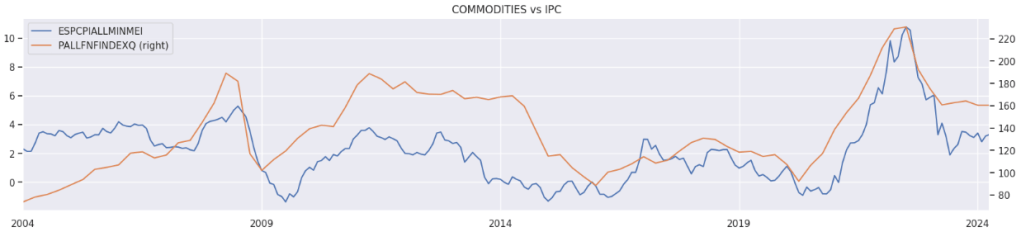 - Materias primas: Los precios de las materias primas, están muy correlacionados a la inflación, ya que dichos aumentos, pueden traducirse en el incremento de los precios en los bienes finales. En la siguiente gráfica, se muestra como la evolución de precios de las materias primas va muy ligada a la evolución de la inflación.