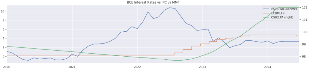 - Mercados monetarios: En los periodos inflacionarios, una herramienta que tienen los bancos centrales, es la de subir los tipos de interés, con tal de reducir la demanda, e impedir así que la economía siga calentándose. La subida de tipos hace que el préstamo de dinero a corto plazo sea más caro, lo que hará que los mercados monetarios tengan un buen rendimiento con un riesgo muy reducido. En el siguiente gráfico podemos ver como una subida del IPC provoca una subida de tipos de interés, que a su vez hace que el rendimiento de un fondo monetario aumente.
