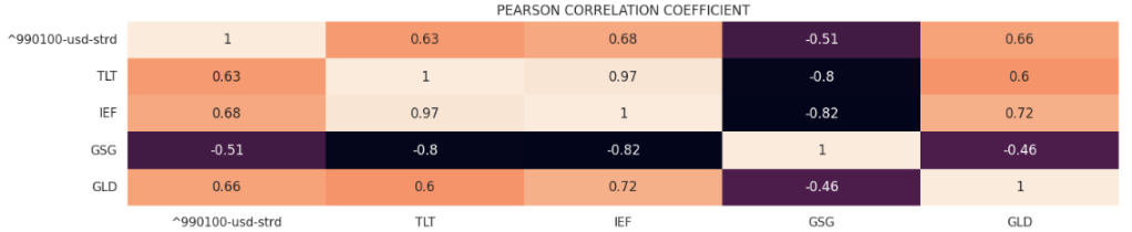En la siguiente imagen, se puede observar como la cartera “All Weather”, ha proporcionado un alto grado de diversificación entre sus diferentes activos. Podemos ver que, el grado más alto de correlación, lo hemos obtenido entre los bonos gubernamentales a largo y medio plazo, “TLT” y “IEF”, con un coeficiente de correlación de Pearson de 0’97. Por otra parte, entre las materias primas y los bonos gubernamentales “GSG”, “TLT” y “IEF” respectivamente, se ha obtenido el menor coeficiente de correlación de todos, -0’82, ofreciendo un grado altísimo de diversificación entre estos activos.