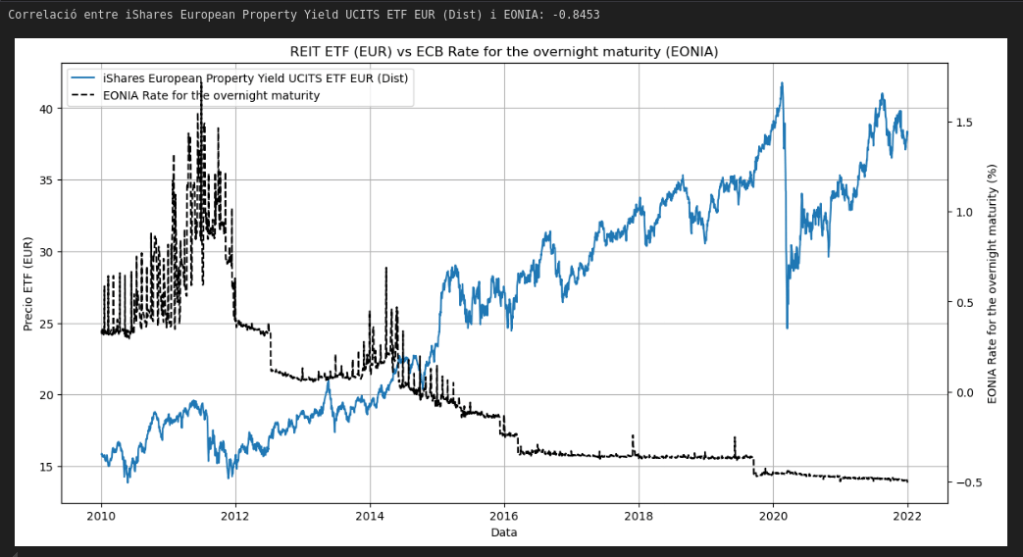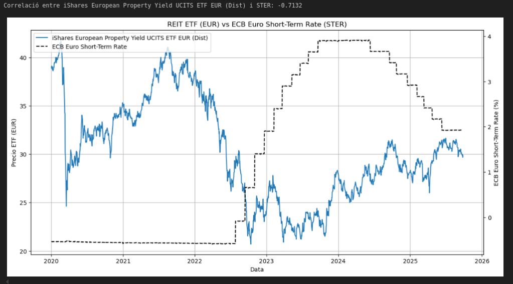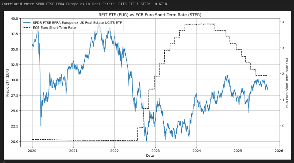 - 📉 Existe una relación negativa sólida entre los movimientos de tipos monetarios (EONIA/€STR) y el comportamiento bursátil de los ETFs inmobiliarios europeos.