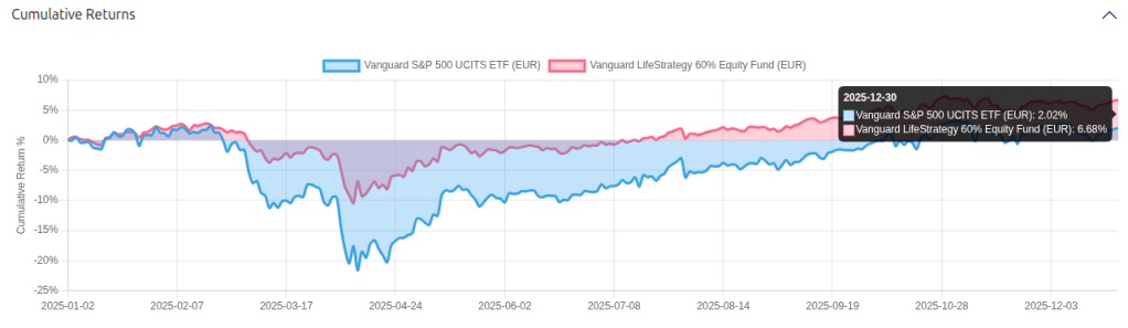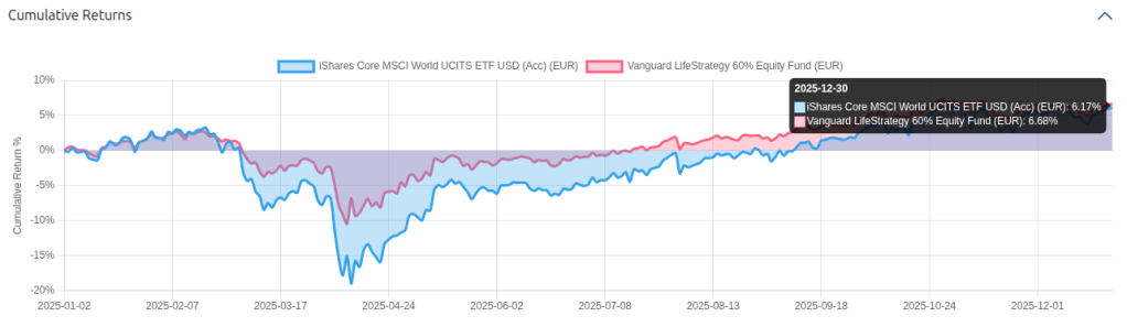 Aunque MSCI World y LifeStrategy 60% terminan el año con rentabilidades muy similares, el recorrido hasta ese punto ha sido radicalmente distinto.