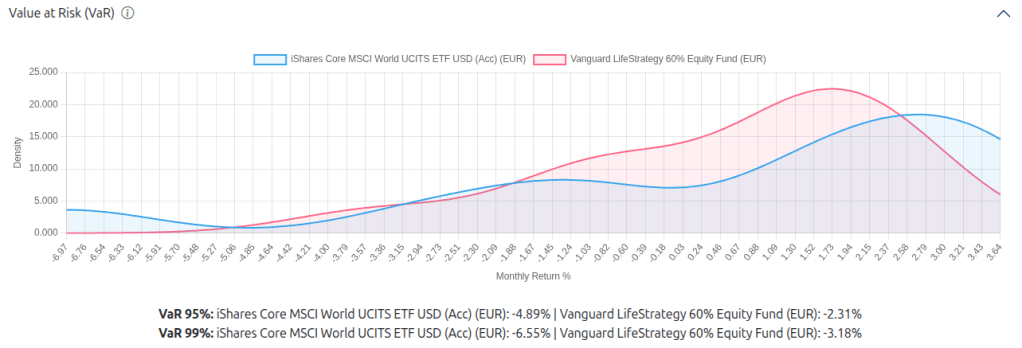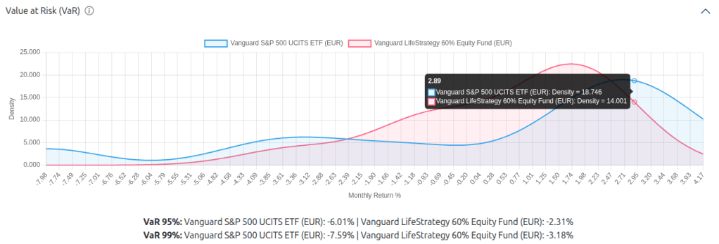 - En un mes muy adverso (VaR 95%), una cartera 100% S&P 500 puede perder casi el triple que LifeStrategy 60%.
