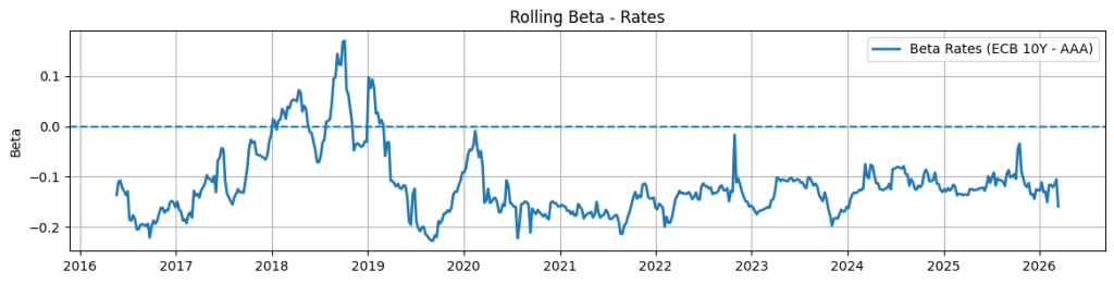 Cuando incorporamos los tipos de interés al análisis —en este caso, la curva a 10 años de los países AAA del BCE, que actúa como referencia libre de riesgo en la zona euro— aparece un patrón mucho más claro.