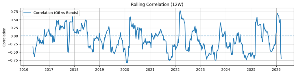 Pero cuando miras los datos, la relación está lejos de ser estable. Hay periodos donde petróleo y bonos se mueven en direcciones opuestas, otros donde prácticamente no hay relación, e incluso momentos en los que se mueven en la misma dirección.